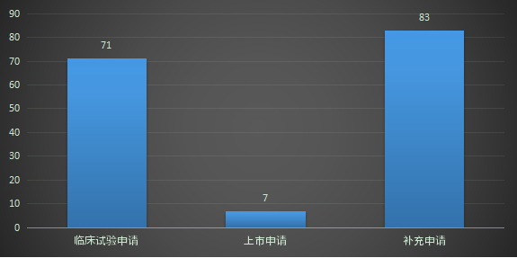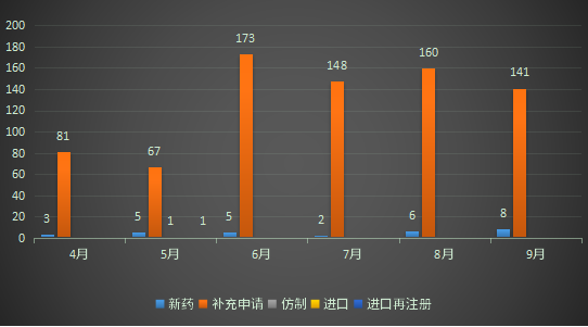 9月份CDE完成審評的化藥注冊申請160個(以受理號計),其中新藥受理號7個,補充申請153個;以審評任務類別統(tǒng)計(以受理號計),IND申請5個,NDA申請2個,補充申請153個。