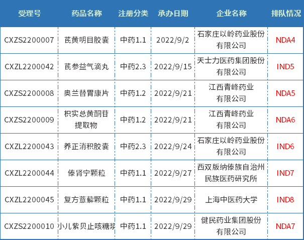 9月共承辦6個中藥1類創(chuàng)新藥和2個中藥2類改良型新藥,共涉及7個品種,其中是IND申請4個,NDA申請4個;下表為9月新承辦的中藥新藥。
