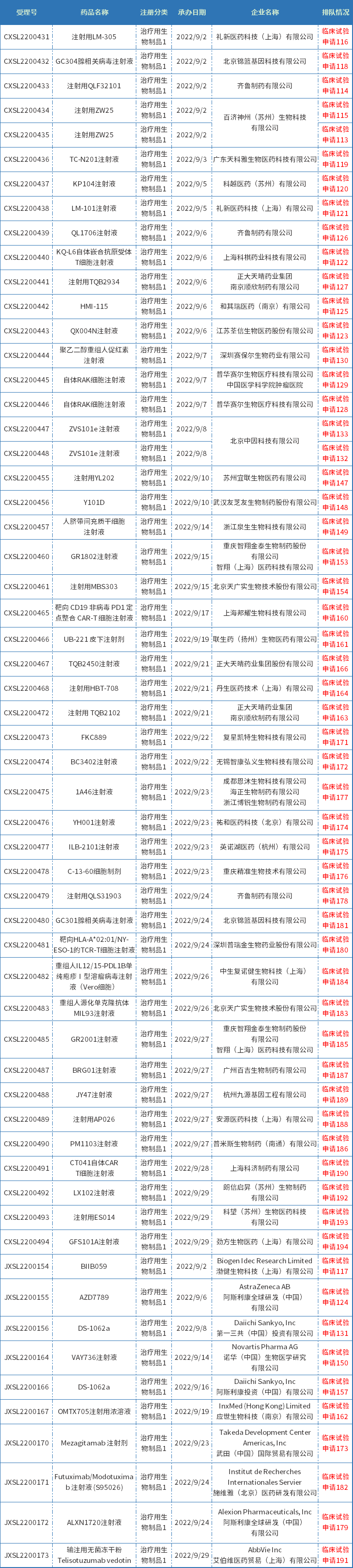 9月有58個1類治療用生物制品受理號獲得承辦,其中均是臨床試驗申請,目前都已經(jīng)進入相應序列排隊待審;下表為9月新承辦的治療用生物制品1類創(chuàng)新藥。