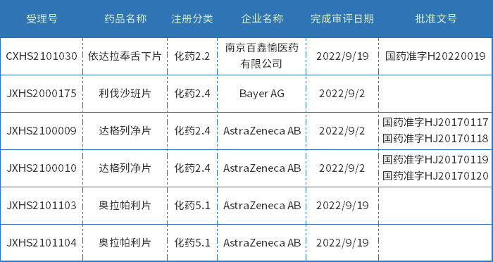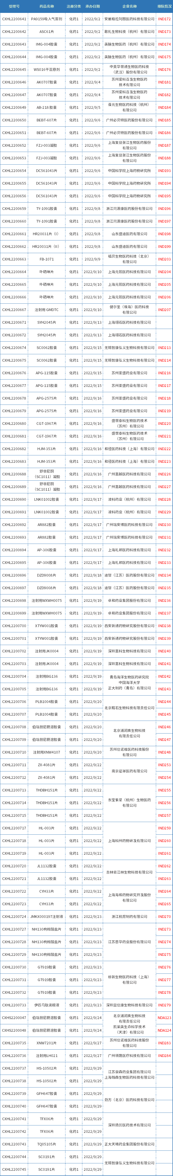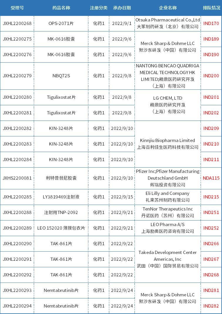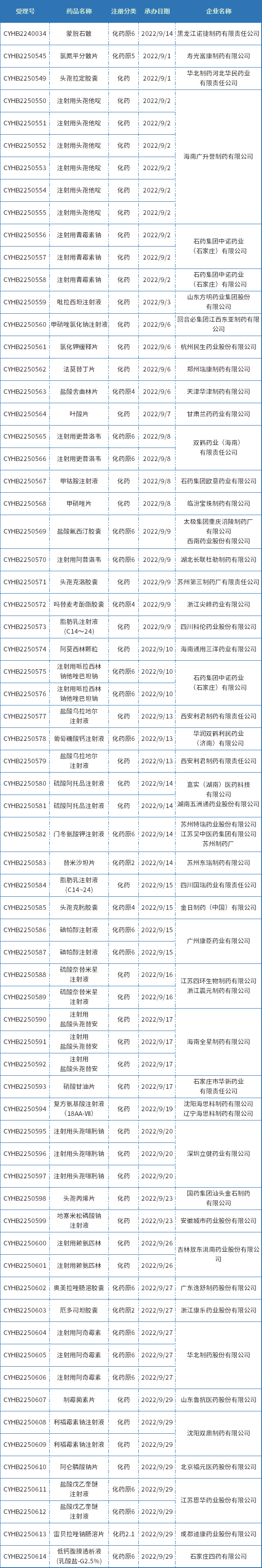 表一 2022年9月新承辦的化藥1類國產(chǎn)新藥