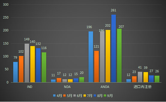 9月份CDE承辦新的化藥注冊申請865個(以受理號計),其中新藥申請受理號102個,進口受理號81個,仿制申請受理號236個,補充申請416個,進口再注冊30個;以審評任務類別統(tǒng)計(以受理號計),IND申請116個,ANDA申請207個,NDA申請20個,進口再注冊申請26個;2022年4-9月CDE化藥各審評任務類別申請受理情況詳見圖三。